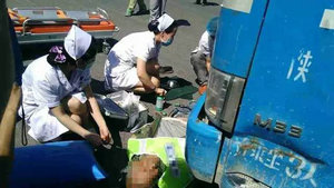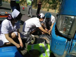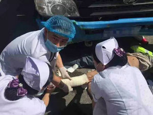 此次演练以道路施工现场的交通事故急救为主要内容,以施工时偶发交通事故为背景,一辆大货车将正在道路上施工的一名工人撞到,演练随即展开。事故发生后工队立即竖起警示牌封锁现场,防止无关人员和车辆靠近。与此同时,工友立即拨打了120,医疗队第一时间赶赴现场,简单了解完情况后,用提前备好的绷带、钢板等材料对伤者进行骨折部位固定处理,并对表皮伤口进行消毒处理。在前期紧急处理工作完成后将伤者移上担架,抬上救护车,送往医院做进一步救治。