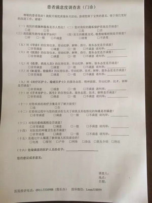 此次满意度调查活动分“线下”和“线上”两种形式。线下的纸质问卷调查,对象主要为即将就诊和正在就诊的患者,线上电子问卷则主要针对一些以前就诊过的患者。据了解此次满意度调查活动之所分两种不同的形式主要是考虑到医院的服务群体年轻人居多,加上现在网络不断普及,电子问卷的形式可能更符合年轻人的习惯,所以医院方面希望通过电子问卷的形式,弥补传统问卷的“真空”,将调查范围最大化,收集到更多有用的信息,以便找准医院管理等方面的不足,为下一步制定和调整政策提供更多依据和更好的参考。